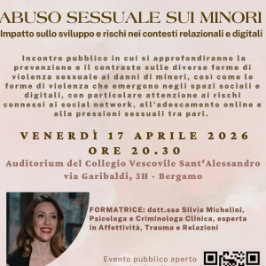 Impatto sullo sviluppo e rischi nei contesti relazionali e digitali Incontro pubblico in cui si approfondiranno la prevenzione e il contrasto sulle diverse forme di violenza sessuale ai danni di minori, così come le forme di violenza che emergono negli spazi sociali e digitali, con particolare attenzione ai rischi connessi ai social network, all'adescamento online e alle pressioni sessuali tra pari. La serata sarà tenuta dalla dott.ssa Silvia Michelini, Psicologa e Criminologa Clinica, esperta in Affettività, Trauma e Relazioni.Venerdì 17...