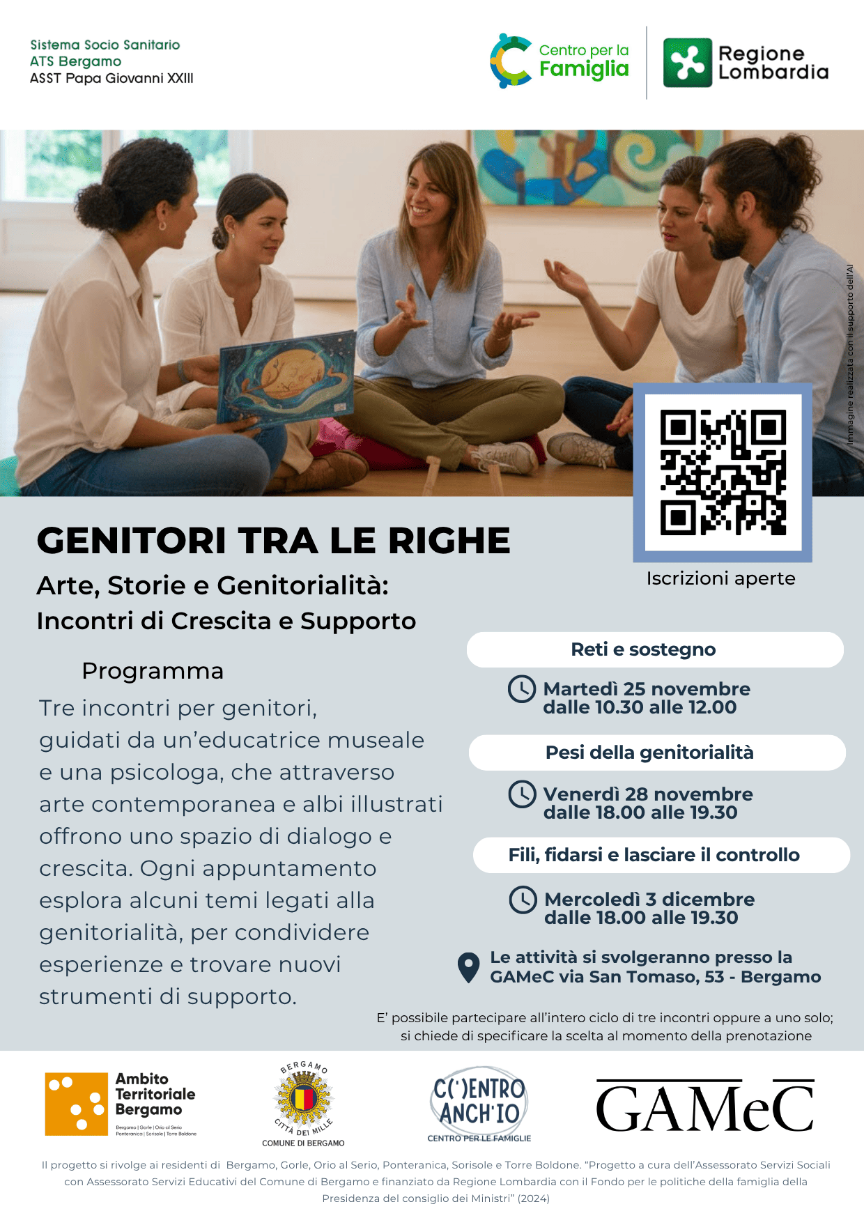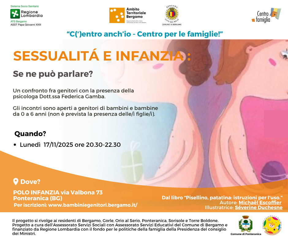 In questa pagina trovate i laboratori proposti all'interno del progetto C(')ENTRO ANCH'IO - Centro per le famiglie. L’iniziativa, promossa dall'Assessorato Servizi Sociali e dall'Assessorato Servizi Educativi del Comune di Bergamo, mira a creare una rete di supporto per le famiglie, grazie alla collaborazione con diverse realtà del territorio. È finanziato dalla Regione Lombardia tramite il Fondo per le politiche della famiglia della Presidenza del Consiglio dei Ministri e si rivolge ai residenti di Bergamo e dei comuni limitrofi (Gorle, Orio al Serio, Ponteranica, Sorisole, Torre Boldone). Un incontro di confronto con la psicologa Dott.ssa Federica Gamba per genitori di bambine e bambini da 0 a 6 anni Lunedì 17 Novembre dalle 20,30 alle 22,30 presso Polo Infanzia in via Valbona 73 a Ponteranica (BG) Per iscrivervi cliccate qui (completo) Dal Progetto C(')entro anch'io- Centro per le famiglie in collaborazione con Gamec presenta: Genitori fra le righe - Arte , storia e Genitorialità. Incontri di crescita e supporto Presso GAMeC Via San Tomaso 53 a Bergamo Martedì 25 Novembre dalle 10.30 alle 12.00 RETI E SOSTEGNO Venerdì 28 Novembre dalle 18.00 alle 19.30 PESI DELLA GENITORIALITÀ Mercoledì 3 dicembre dalle 18.00 alle 19.30 FILI, FIDARSI E LASCIARE IL CONTROLLO Per le iscrizioni cliccare qui