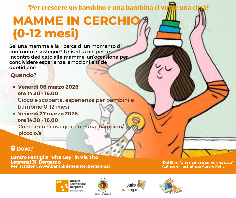 Un nuovo appuntamento di Un incontro per mamme con bambine e bambini dagli 0 ai 12 mesi con le educatrice degli Spazi Gioco Comunali Presso lo Spazio Gioco "Grandi e piccini" c/o Centro Famiglia "Rita Gay" in via Legrezi 31 a BergamoMamme in cerchio - Gioco e scoperta: Esperienze per bambini/e 0 -12 mesi e Come e con cosa gioca un bambino o una bambina piccolo/a