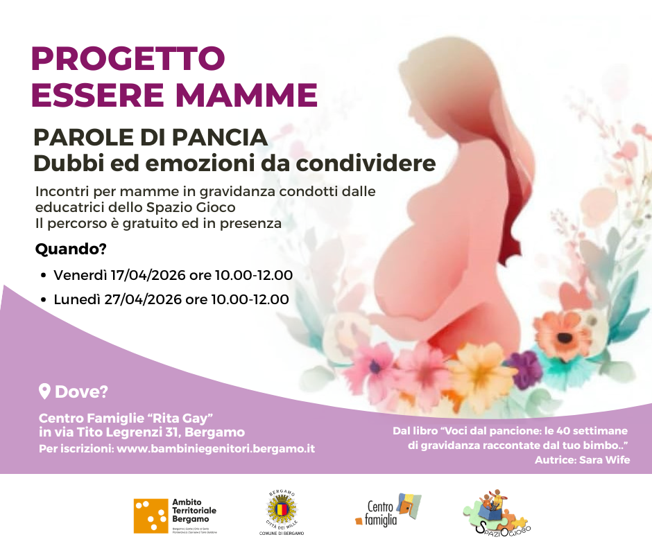 Nuovi incontri del PROGETTO ESSERE MAMME dedicato alle donne in gravidanza: PAROLE DI PANCIA: Dubbi ed emozioni da condividere Venerdì 17/04/2026 e Lunedì 27/04/2026 dalle 10.00 alle 12.00 Presso il Centro Famiglie "Rita Gay" in via Legrenzi 31 a Bergamo Per le iscrizioni cliccate qui