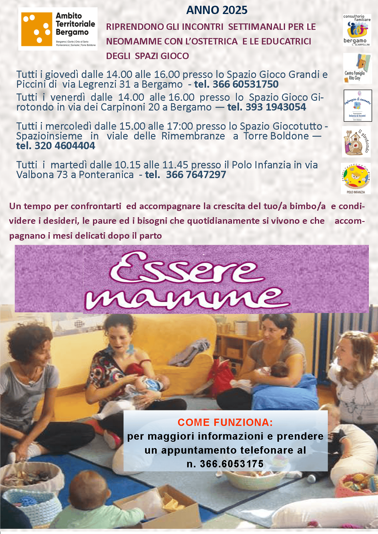 Il Progetto ESSERE MAMME è un'iniziativa gratuita dell'Ambito territoriale di Bergamo in collaborazione con i consultori familiari del territorio promossa all'interno di 2 spazi gioco cittadini e di 2 spazi presentu nei Comuni appartenenti all'Ambito e in collaborazione per azioni differenziate anche con gli altri Spazi Gioco presenti sul territorio. La prima area d'intervento del Progetto propone alle mamme con bambine e bambini tra 0 e 6 mesi degli incontri di gruppo settimanali con la presenza di un’ostetrica ed un'educatrice in cui condividere i desideri, le paure e i bisogni che quotidianamente si vivono e accompagnano i mesi delicati dopo il parto. È preferibile (ma non obbligatoria) la prenotazione presso i numeri che trovate nel volantino. In stretta collaborazione con il Progetto “Essere mamme” puoi chiamare il numero telefonico 366.6053175 anche per avere informazioni/consulenza o un confronto per trovare insieme una soluzione ed eventualmente valutare la possibilità di una visita di un’ostetrica a casa tua. Le azioni successive riguardano: