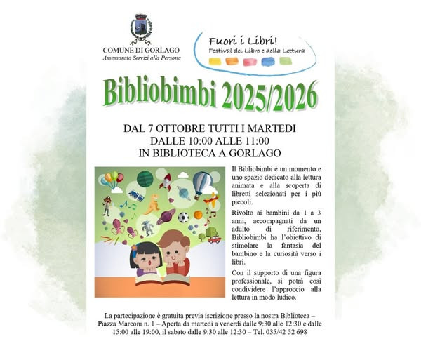 Per i bambini da 1 a 3 anni, accompagnati da un adulto. L'obiettivo è stimolare la fantasia del bambino e la curiosità verso i libri. Per ISCRIZIONI chiama o scrivi a: 035 42 52 698 - biblioteca@comune.gorlago.bg.it