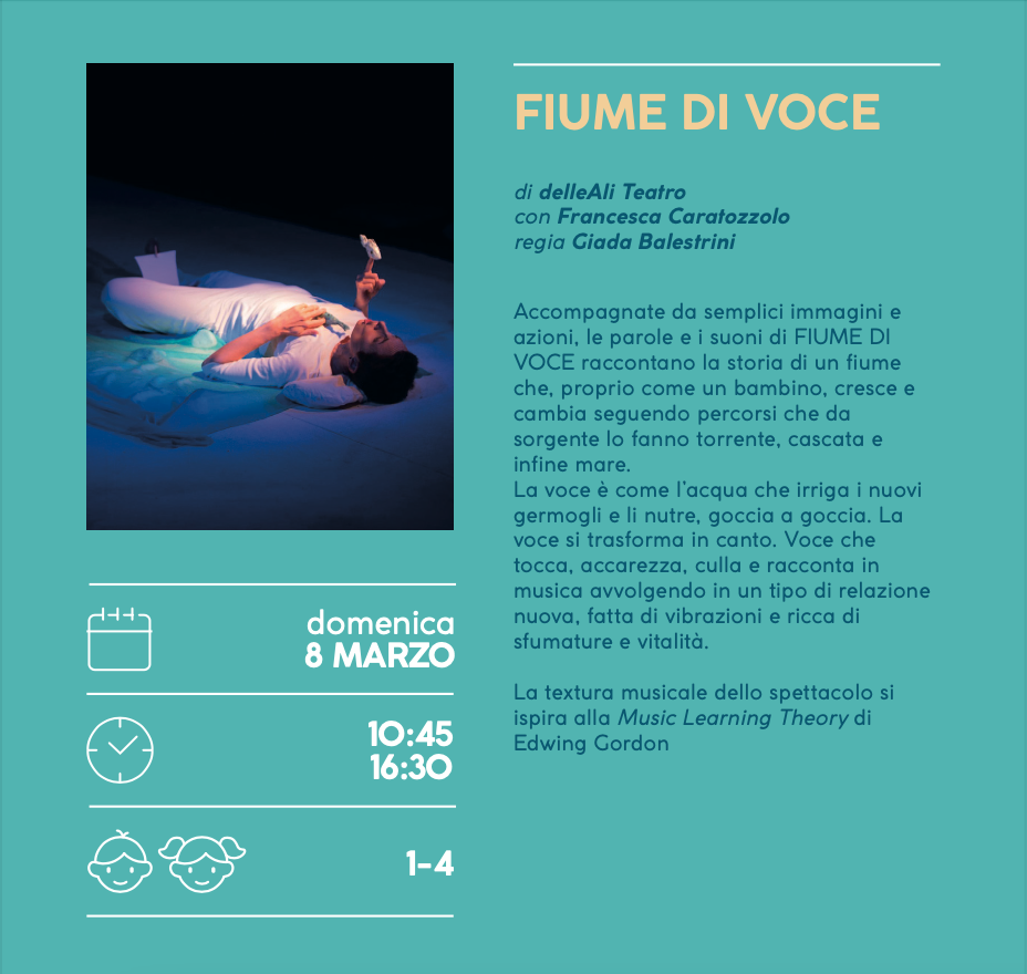 di delleAli Teatro Accompagnate da semplici immagini e azioni, le parole e i suoni di FIUME DI VOCE raccontano la storia di un fiume che, proprio come un bambino, cresce e cambia seguendo percorsi che da sorgente lo fanno torrente, cascata e infine mare.