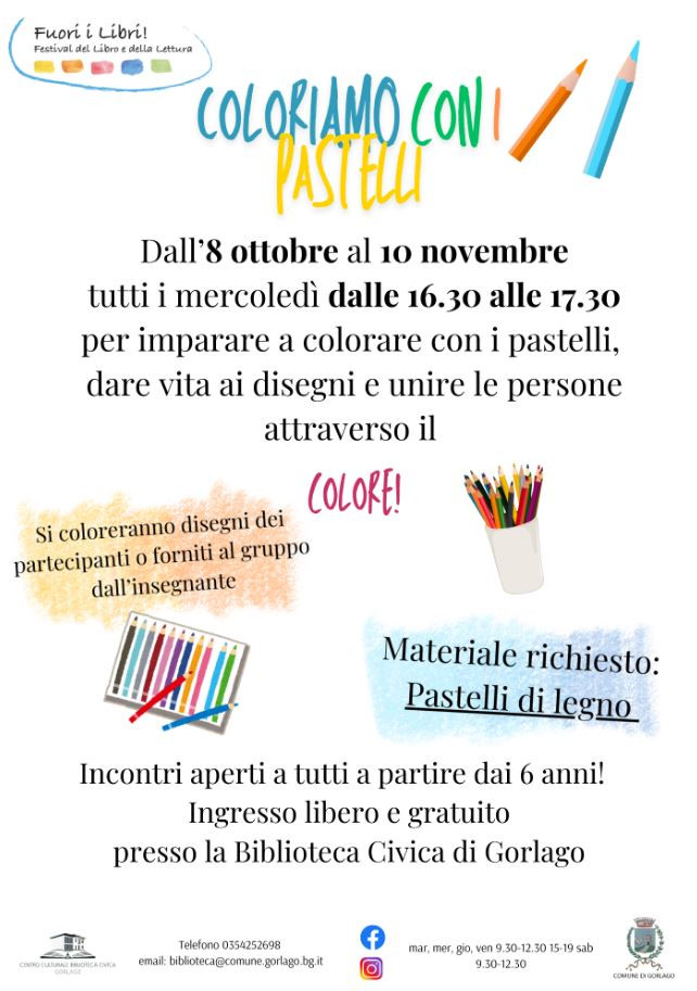 Un’occasione per imparare a usare i pastelli, dare vita ai disegni e condividere insieme la bellezza del colore. Durante gli incontri si coloreranno disegni personali portati dai partecipanti oppure forniti dall’insegnante. Evento gratuito per info scrivere una mail alla biblioteca.