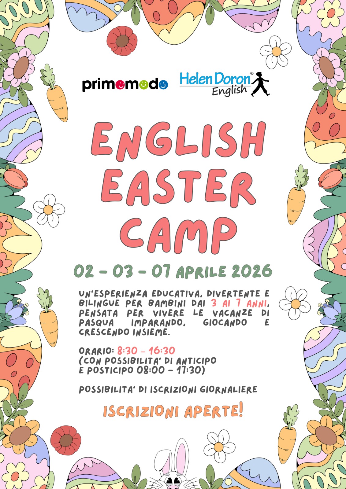 Viale Giulio Cesare, 31Un'avventura di Pasqua tutta in inglese al Centro Primomodo! Un’esperienza pensata per i più piccoli (3-7 anni), tra giochi, scoperte e tanto divertimento! Quando: 02 - 03 - 07 Aprile 2026 Orario: 08:30 – 16:30 (con possibilità di anticipo/posticipo 08:00 – 17:30)