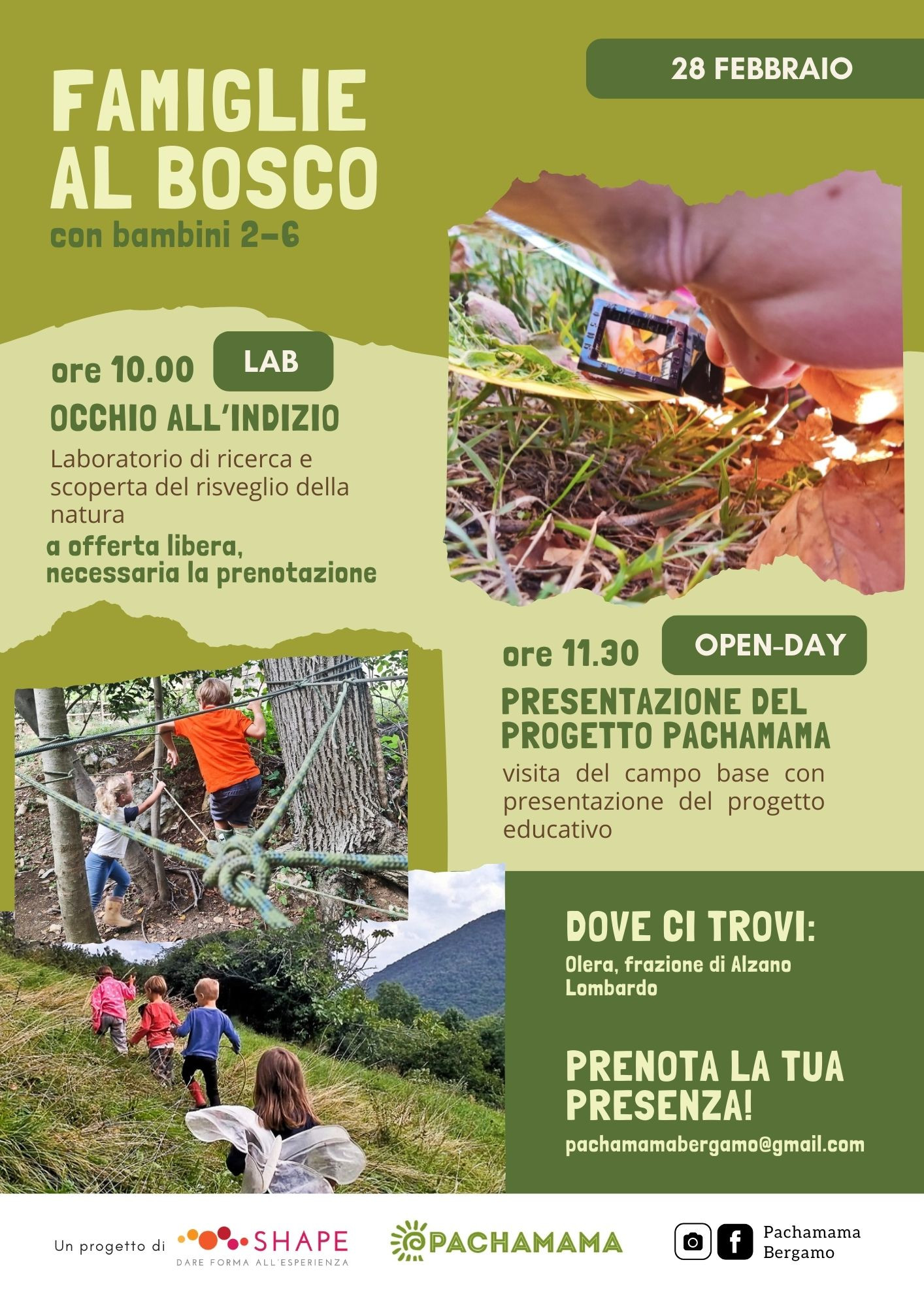 Vorresti travestirti da Sherlock Holmes e venire con noi alla ricerca di indizi? Equipaggiati dei giusti attrezzi andremo nel bosco alla scoperta dei tanti segni che la natura ci sta mandando (laboratorio ad offerta libera) e successivamente presentazione del progetto Pachamama