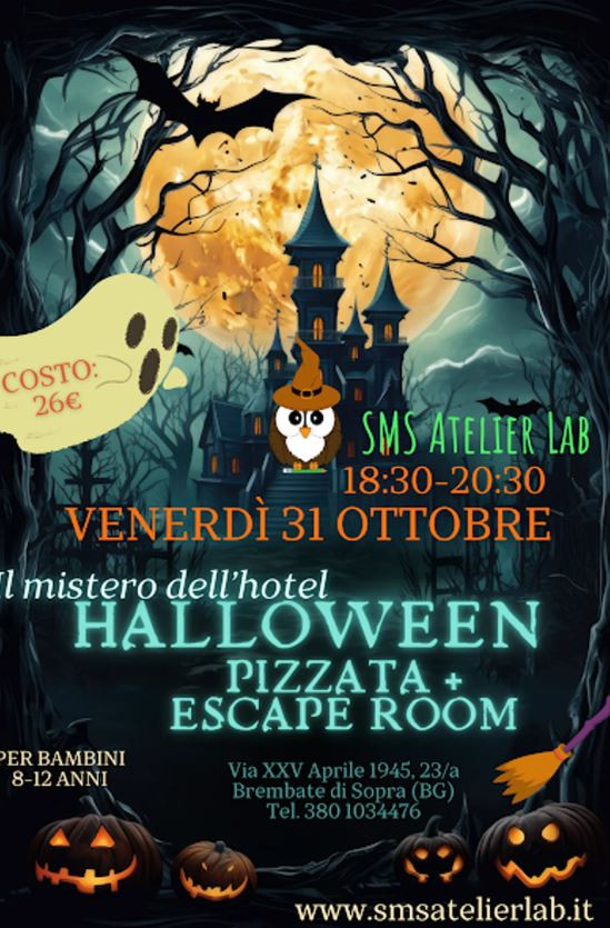 Serata di mistero con escape room e pizzata. L'hotel Halloween è pronto ad accogliere i suoi mostruosi ospiti, ma il direttore si accorge che qualcosa è misteriosamente sparito. Evento a pagamento con iscrizione obbligatoria
