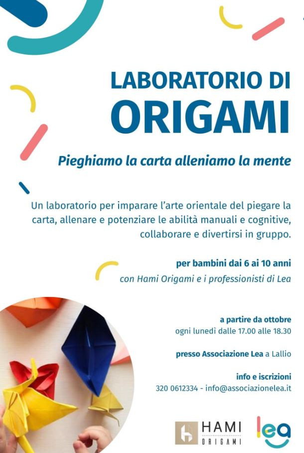 Un laboratorio per imparare l’arte orientale del piegare la carta, allenare e potenziare le abilità manuali e cognitive, collaborare e divertirsi in gruppo. Per info e iscrizioni, scrivere una mail a info@associazionelea.it