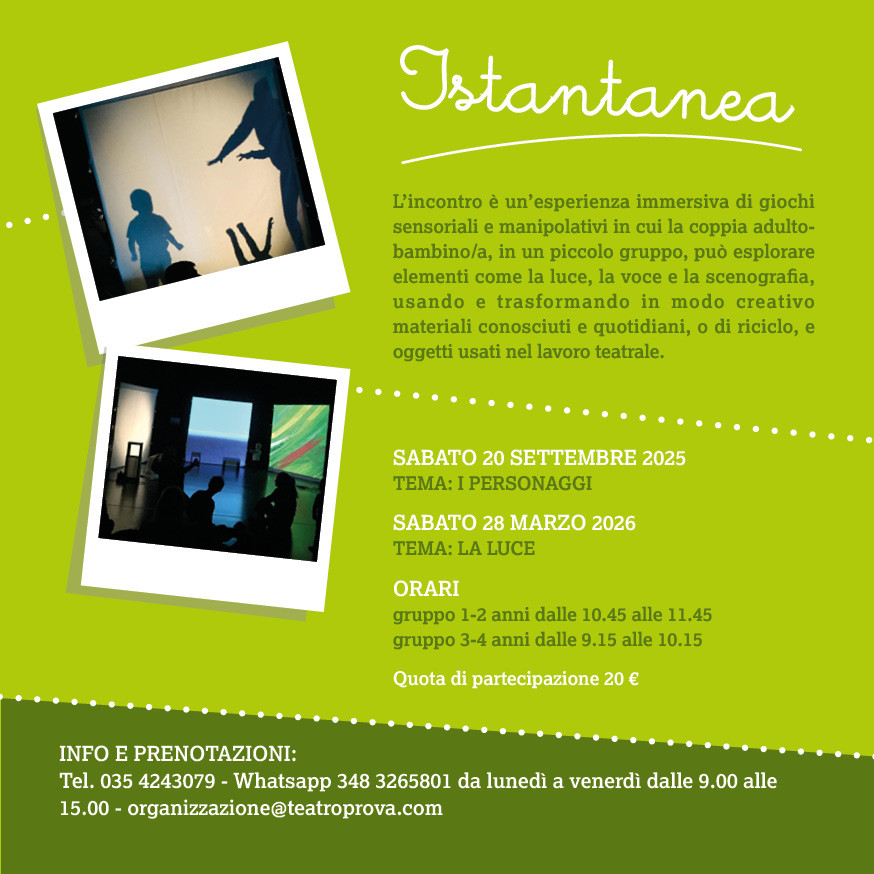 approfondisci qui: https://www.teatroprova.com/progetti/piccoli-sguardi/ Sabato 28 marzo 2026 Tema: la luce Orari gruppo 1-2 anni: dalle 10.45 alle 11.45 gruppo 3-4 anni: dalle 9.15 alle 10.15 Quota 20€ a coppia adulto-bambina/o