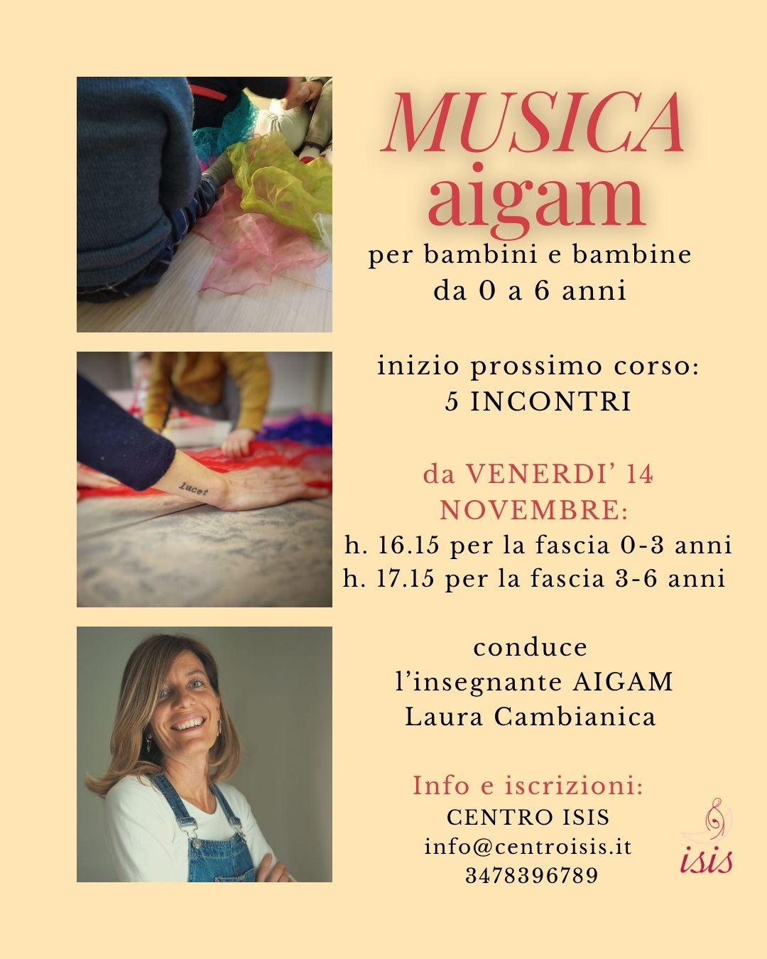 5 incontri di Musica Aigam per bambine e bambini da 0 a 6 anni. Divisi in fasce orarie. Maggiori info alla mail info@centroisis.it