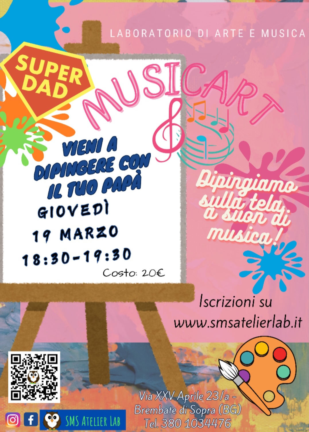 Sempre tutto disciplinato, cosa ne dici di lasciare davvero spazio alla creatività? Vieni a sfogarla con MusicArt, totale libertà nel dipingere la tua tela, il tutto con sottofondo musicaleE per la festa del papà vieni a dipingere insieme a lui, un modo per passare del tempo insieme. Costo 20 Euro