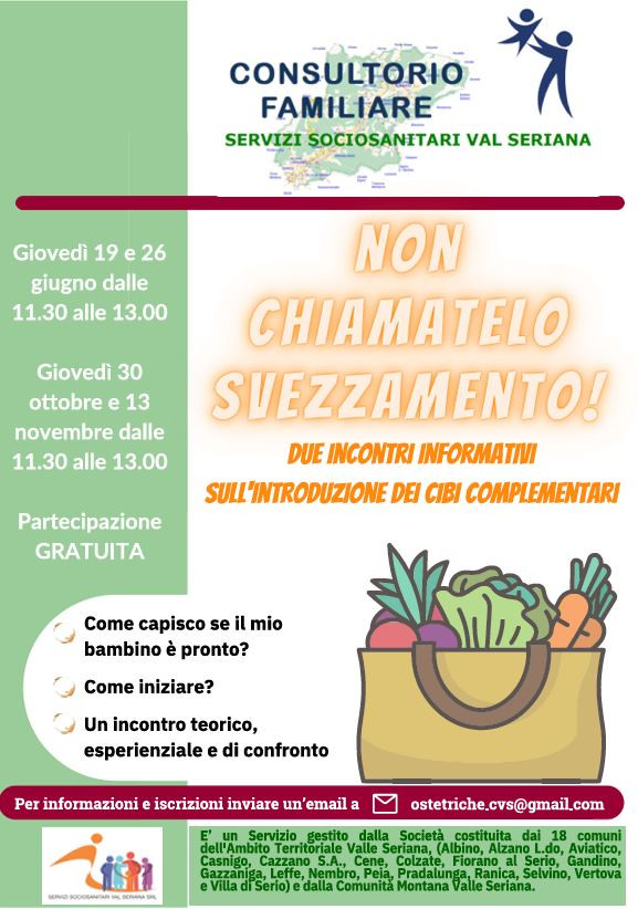 Non chiamatelo svezzamento: due incontri introduttivi e informativi sull'introduzione dei cibi complementari. Scrivere una mail a ostetriche.cvs@gmail.com per info su costi e iscrizioni