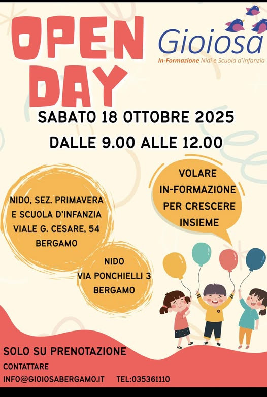 Open day dedicata alla sezione primavera del Nido d'Infanzia e Scuola d'Infanzia. Evento gratuito su prenotazione alla mail info@gioiosabergamo.it