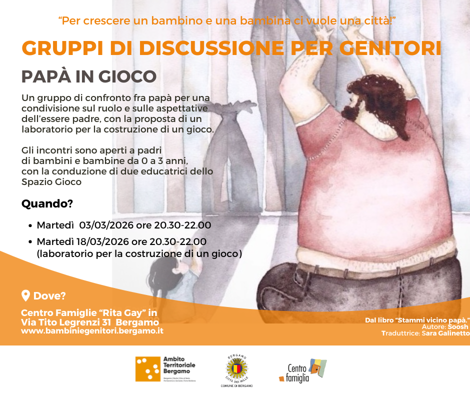 Un gruppo di confronto fra papà per una condivisione sul ruolo e sulle aspettative dell’essere padre. Due incontri per soli padri di bambine e bambini da 0 a 3 anni. Nel secondo incontro verrà proposto un laboratorio per la costruzione di un gioco. evento gratuito con iscrizione obbligatoria.