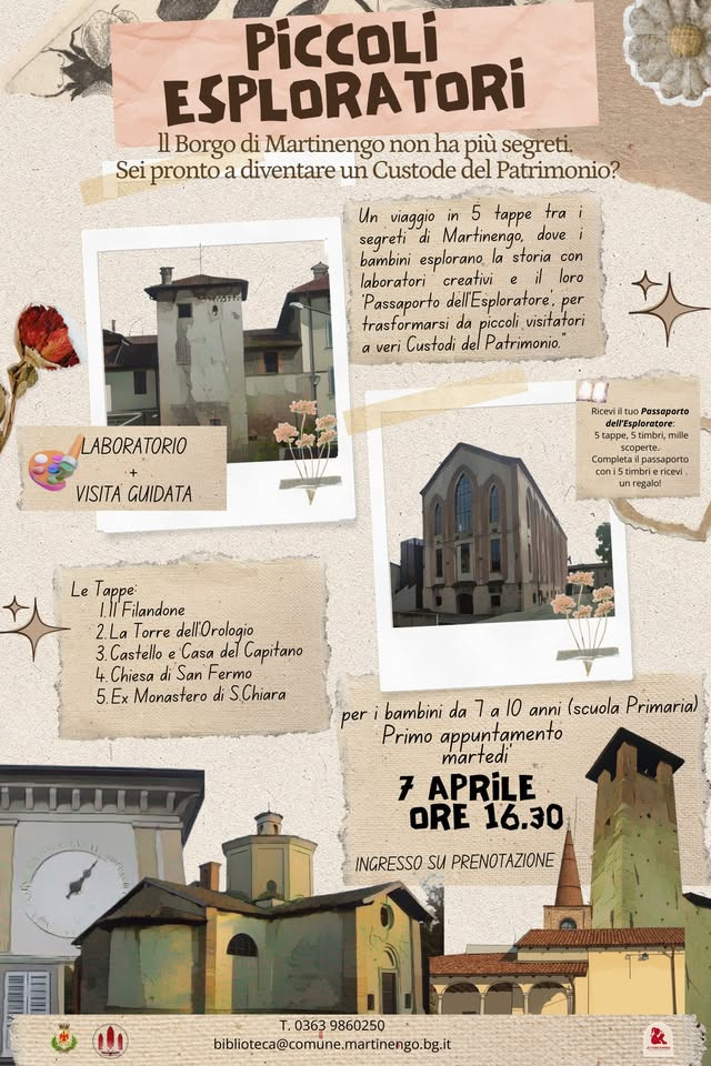 Siete pronti a trasformare i vostri bambini in veri Custodi del Patrimonio? Parte il viaggio in 5 tappe alla scoperta della storia di Martinengo! Un’avventura tra laboratori creativi e visite guidate mozzafiato. L'ingresso gratuito è su prenotazione scrivi a biblioteca@comune.martinengo.bg.it