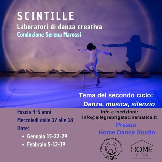 Laboratori di danza creativa: secondo ciclo dedicato alla danza, alla musica e al silenzio. Attività per bambine e bambini da 4 a 5 anni. Evento gratuito. Per info e iscrizioni scrivere a info@allegrabrigatacinematica.it