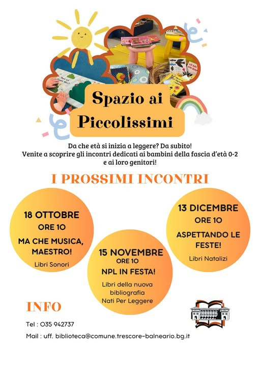 Torna il nostro Spazio ai Piccolissimi!Ingresso gratuito previa prenotazione in biblioteca, ti aspettiamo. Incontri per bambine e bambini da 0 a 2 anni con un adulto. evento gratuito info e iscrizioni via mail