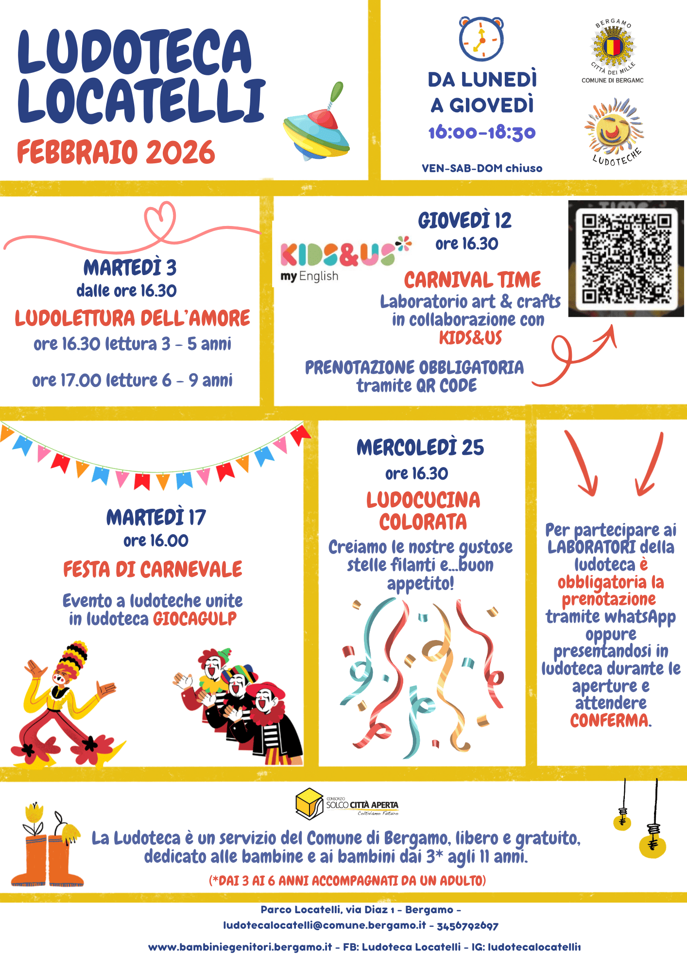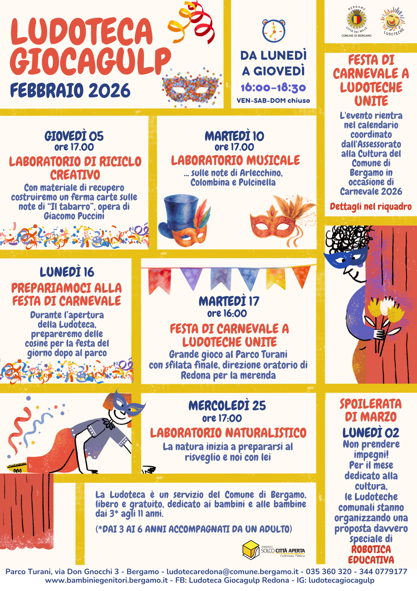 Vi ricordiamo la Tradizionale FESTA DI CARNEVALE a Ludoteche unite che si terrà Martedì 17 Febbraio 2026 alle ore 16.00, presso il PARCO TURANI in via Don Gnocchi, 3 - Bergamo.