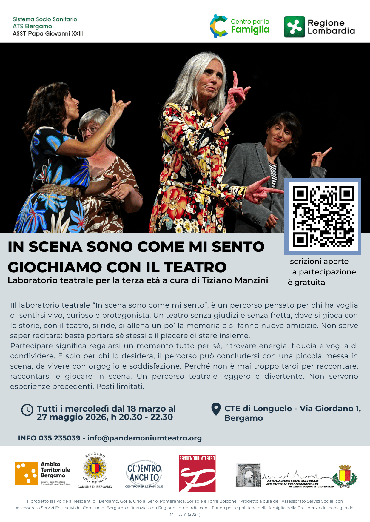 In questa pagina trovate i laboratori proposti all'interno del progetto C(')ENTRO ANCH'IO - Centro per le famiglie. L’iniziativa, promossa dall'Assessorato Servizi Sociali e dall'Assessorato Servizi Educativi del Comune di Bergamo, mira a creare una rete di supporto per le famiglie, grazie alla collaborazione con diverse realtà del territorio. È finanziato dalla Regione Lombardia tramite il Fondo per le politiche della famiglia della Presidenza del Consiglio dei Ministri e si rivolge ai residenti di Bergamo e dei comuni limitrofi (Gorle, Orio al Serio, Ponteranica, Sorisole, Torre Boldone). STREET DANCE laboratorio per ragazzi e ragazze dagli 11 ai 17 anni Laboratorio dedicato all'esplorazione del movimento urbano e dell'espressione personale pensati per coinvolgere ogni generazione. Evento gratuito ad accesso libero 📅 MARTEDÌ 24 e 31 MARZO 2026 MARTEDÌ 14 e 21 e 28 APRILE 2026 🕒 dalle ore 14.30 alle ore 16.30 📍 ℅ Sala delle Associazioni in via Unione 1 a Ponteranica - Bergamo IO SCOPRO, IO GIOCO, IO SONO Laboratori per bambini e bambine da 18 mesi ai 3 anni 📅 MERCOLEDÌ 1 APRILE "Ci vuole un seme" (Completo) MERCOLEDÌ 8 APRILE "Qual'è il tuo colore?" (Completo) MERCOLEDÌ 15 APRILE "Tu lo sai fare?" (Completo) MERCOLEDÌ 22 APRILE "Le tradizioni dell'arte" MERCOLEDÌ 29 APRILE "Alla scoperta di me" 🕒 dalle ore 16.00 alle ore 18.00 📍 ℅HUB4KIDS Via Serassi 17/d - Bergamo Partecipazione gratuita con iscrizione Per iscriverti clicca qui VISITA COMODA Appuntamenti pensati per persone adulte di tutte le età, per concedersi una pausa dalla routine quotidiana. Momenti da vivere con tranquillità,dedicando attenzione ad un'opera diversa ad ogni incontro. Evento gratuito ad accesso libero 📅 MERCOLEDÌ 1 APRILE 2026 🕒 dalle ore 16.30 📍 ℅ GAMeC - Via San Tomaso 53 - Bergamo VIDEOGAMES laboratorio per partecipanti dagli 11 anni in poi Il videogioco può essere usato anche come strumento di crescita e socializzazione. Le attività verranno guidate da professionisti di edugame qualificati, formati specificatamente per utilizzare il gaming come risorsa educativa. Evento gratuito ad accesso libero. 📅 SABATO 11 e SABATO 18 APRILE 2026 🕒 dalle ore 20.00 alle ore 22.00 📍 ℅ HUB FOR KIDS - Via Carlo Serassi 17 /D - Bergamo GIOCHI DA TAVOLO laboratorio proposti dai 2 ai 99 anni Passa una domenica diversa dal solito, unisciti a noi! Il laboratorio offre una vasta selezione di giochi da tavolo, pensati per coinvolgere ogni generazione. Evento gratuito ad accesso libero 📅 DOMENICA 19 APRILE 2026 🕒 dalle ore 14.00 alle ore 18.00 📍 ℅ HUB FOR KIDS - Via Carlo Serassi 17 /D - Bergamo