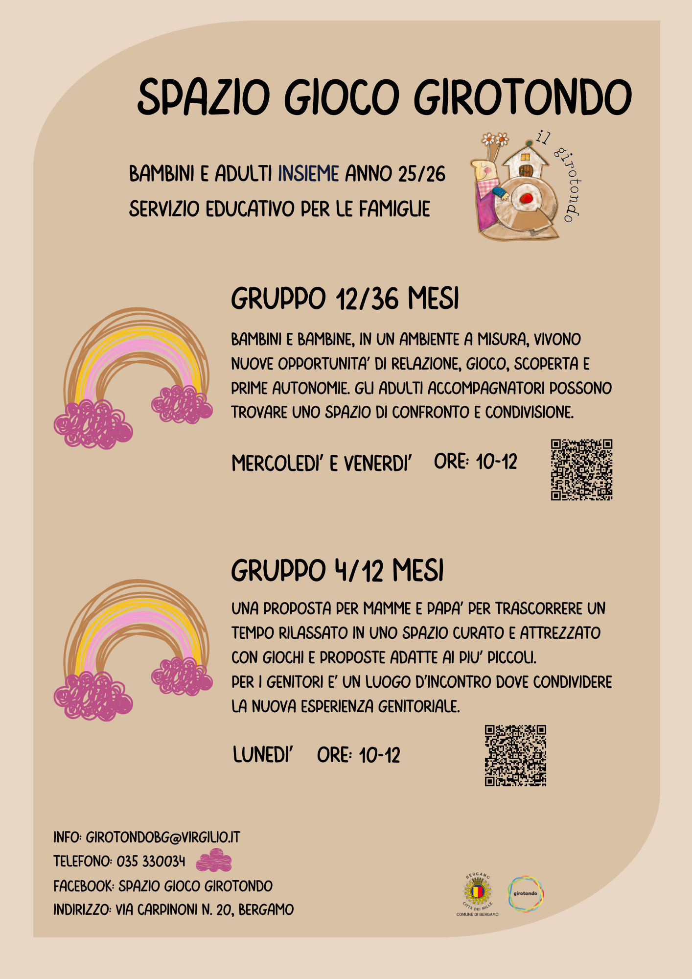 Sono aperte le iscrizioni per l'anno educativo 2025-26Per informazioni tel. al Centro Famiglia Rita Gay al n. 035 399 953 e per le iscrizioni al nuovo anno educativo, accedere al sito del Comune di Bergamo cliccando qui