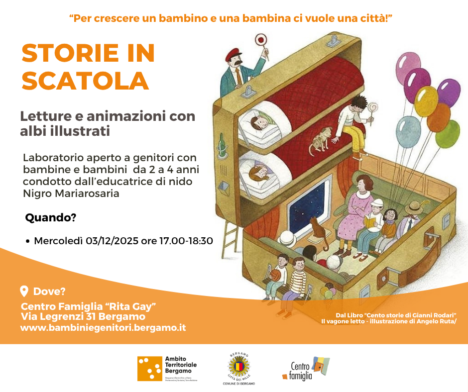 Laboratorio aperto a genitori con bambine e bambini 2-4 anni condotto dall’educatrice di Nido Nigro MariarosariaPresso il Centro Famiglia "Rita Gay" via Legrenzi 31 - BergamoMercoledì 3 dicembre dalle 17.00 alle 18.30Per l'iscrizione cliccate qui