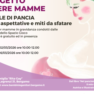 Nuovi incontri del PROGETTO ESSERE MAMME dedicato alle donne in gravidanza: PAROLE DI PANCIA: Sogni, aspettative e miti da sfatare Lunedì 2/03/2026 e Lunedì 16/03/2026 dalle 10.00 alle 12.00 Presso il Centro Famiglie "Rita Gay" in via Legrenzi 31 a Bergamo Per le iscrizioni cliccate qui