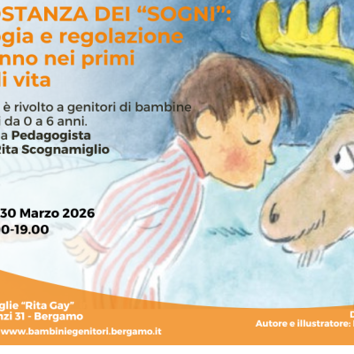 Data e luogo sono cambiati LUNEDÌ 30 marzo dalle 17.00 alle 19.00 presso il Centro Famiglia "Rita Gay" in via Legrenzi 31 a Bergamo La sostanza dei "sogni": fisiologia e regolazione del sonno nei primi anni di vita Incontro per genitori di bambine e bambini 0-6 anni con la conduzione della Pedagogista Dott.ssa Rita Scognamiglio. Per iscriverti