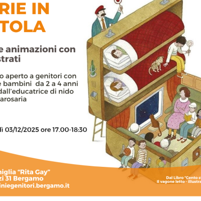 STORIE IN SCATOLA Letture e animazione di albi illustrati Laboratorio aperto a genitori con bambine e bambini 2-4 anni condotto dall’educatrice di Nido Nigro Mariarosaria Presso il Centro Famiglia "Rita Gay" via Legrenzi 31 - Bergamo Mercoledì 3 dicembre dalle 17.00 alle 18.30 Per l'iscrizione cliccate qui