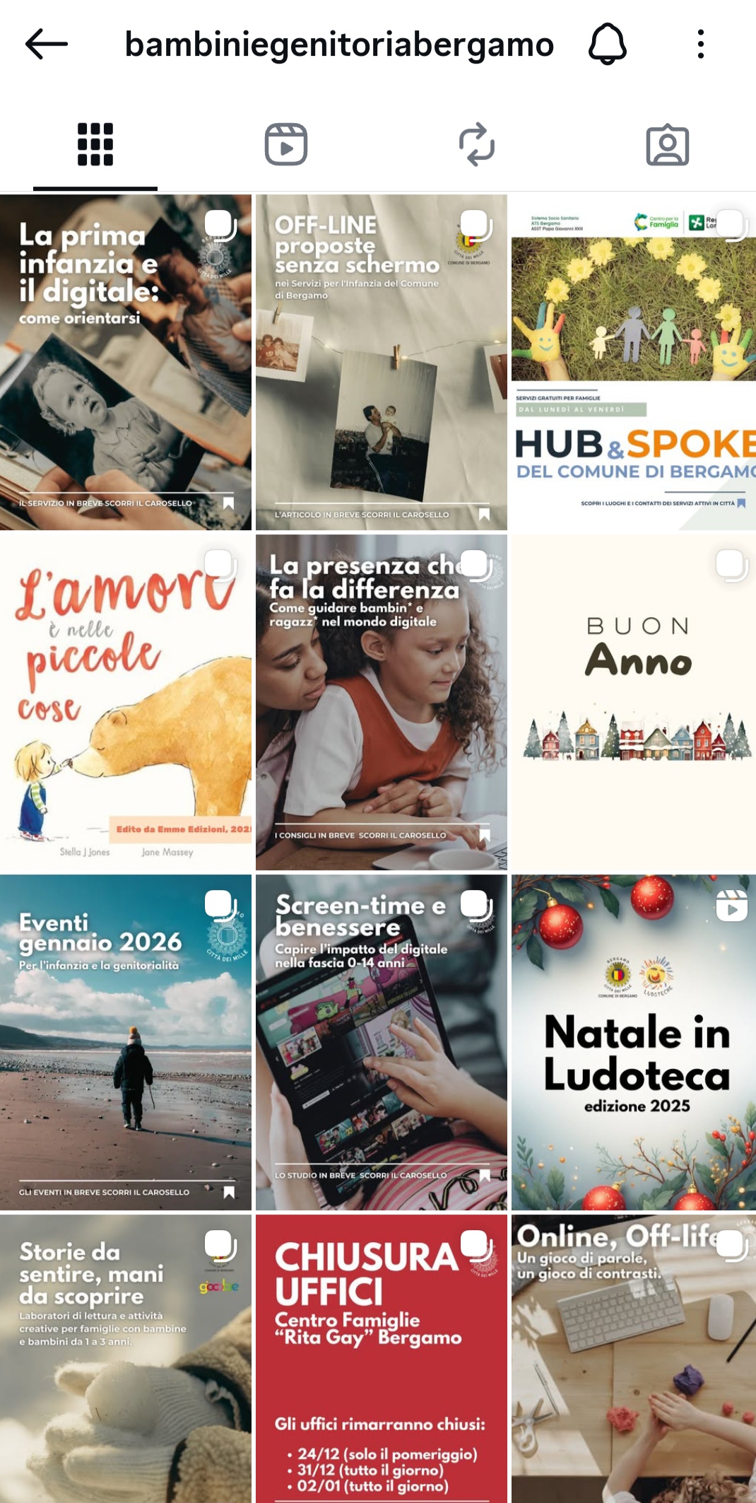 Accanto al blog, i social rispondono a bisogni diversi. Su Facebook il nostro obiettivo è soprattutto quello di orientare e informare. È uno spazio in cui raccontiamo la quotidianità dei servizi, segnaliamo attività, laboratori, proposte educative, appuntamenti del territorio. La scansione settimanale dei contenuti non è casuale: ogni giorno risponde a una funzione precisa, che va dalla riflessione culturale alla valorizzazione delle esperienze nei nidi, negli spazi gioco, nelle ludoteche, fino alla costruzione di una mappa condivisa delle opportunità per le famiglie nella città e nella provincia di Bergamo. È un servizio, prima ancora che una vetrina.