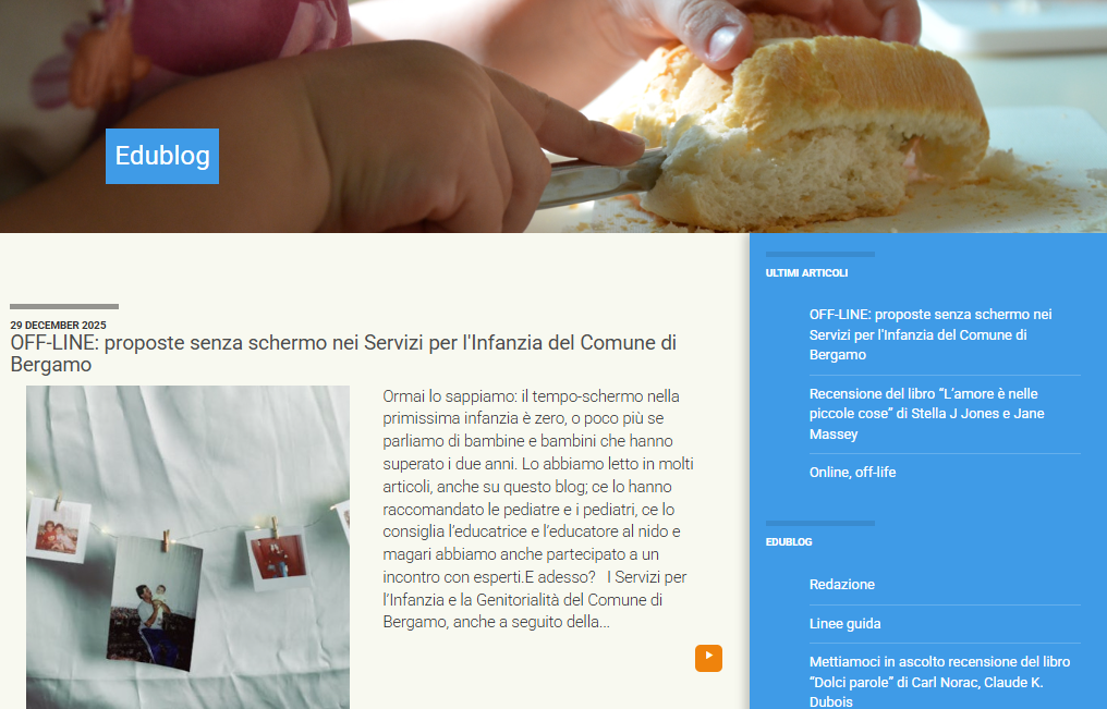(3) EDUBLOG è un blog nato nel 2015 che racconta scelte, esperienze e proposte pedagogiche dei Servizi Educativi del Comune di Bergamo, dedicate alle famiglie con bambini e bambine da 0 a 11 anni, offrendo uno spazio di informazione, confronto e interazione attraverso il racconto di esperienze reali del territorio.